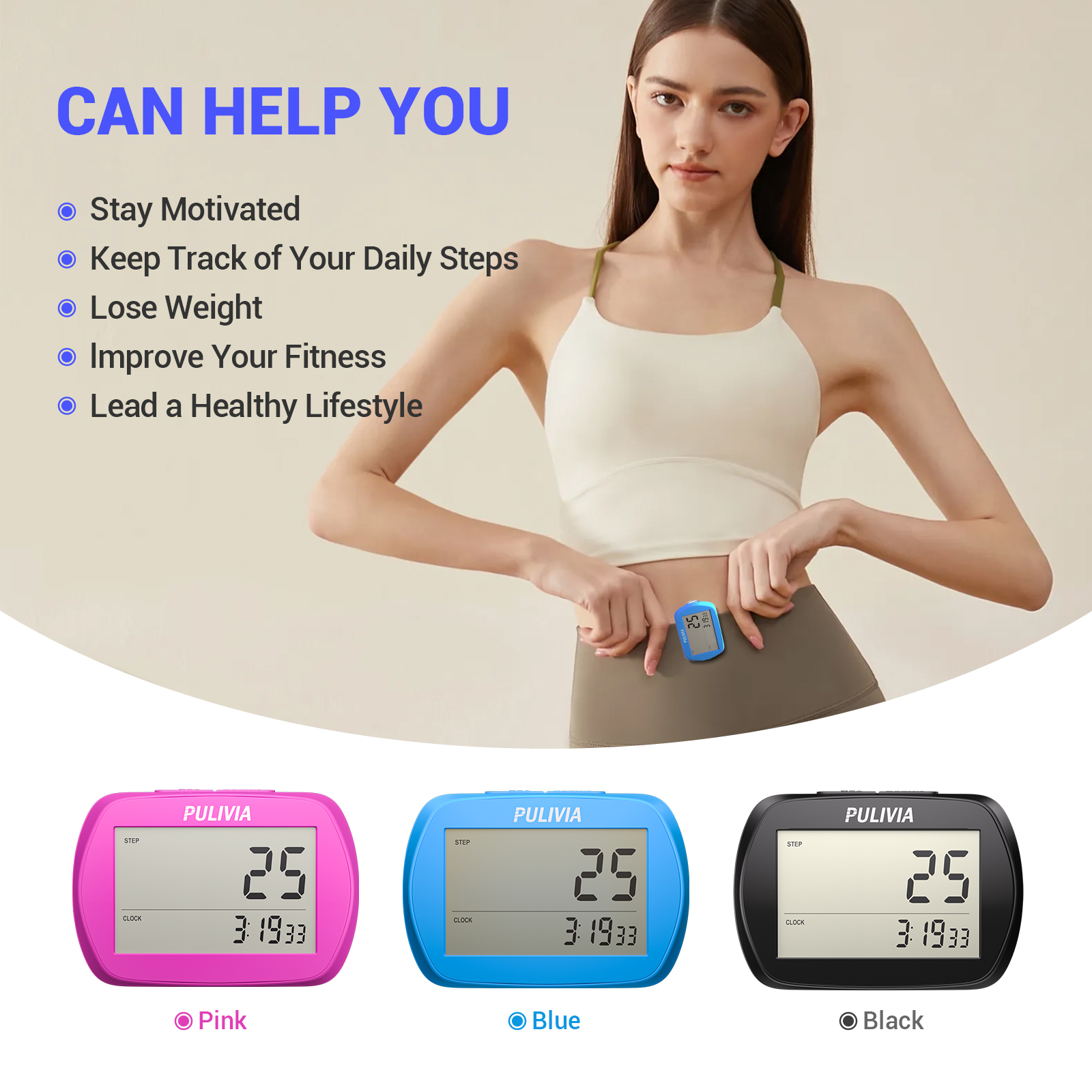 3D Step Counter: The PULIVIA pedometer features a 3D step counter with a clock function, displaying step count and current time on separate screens.