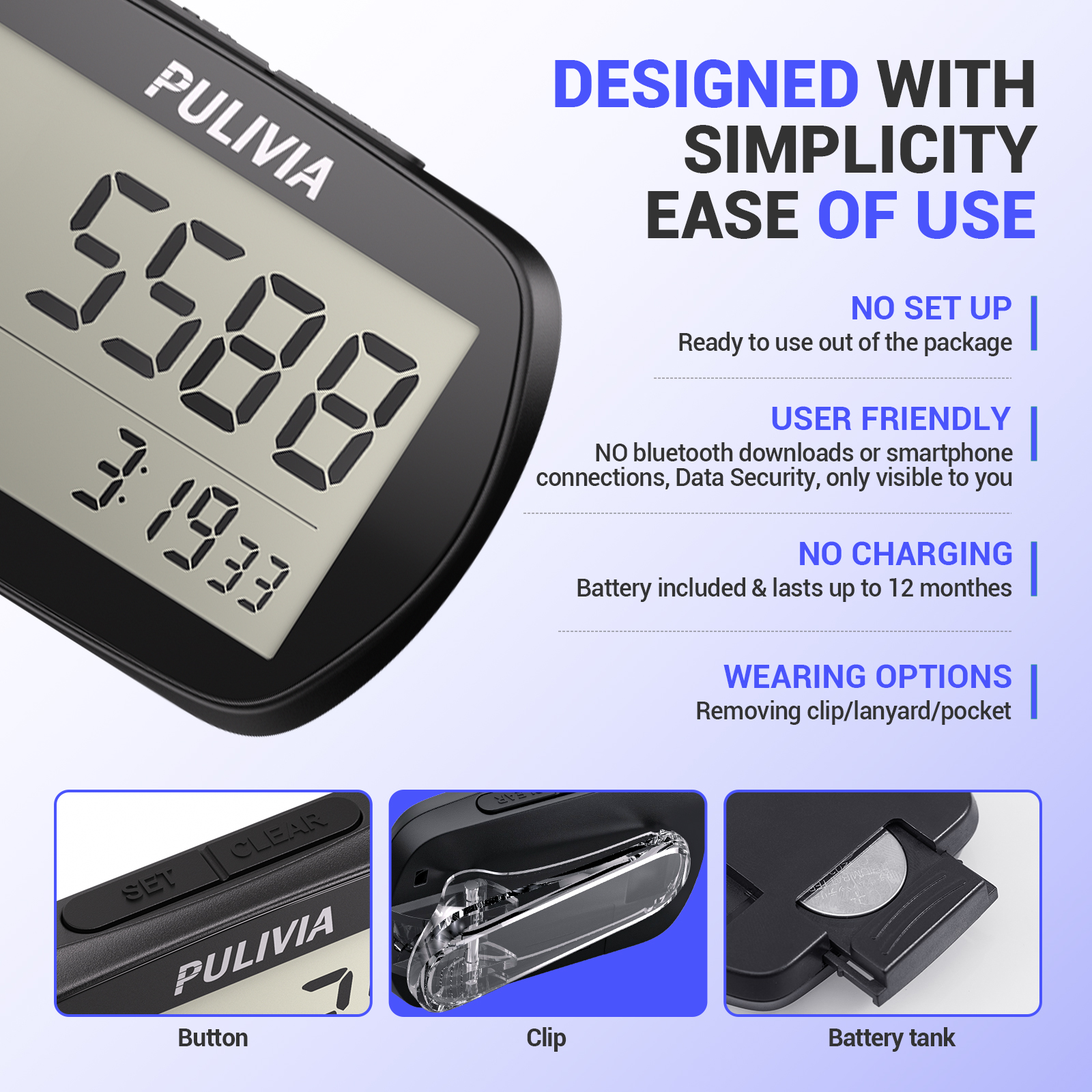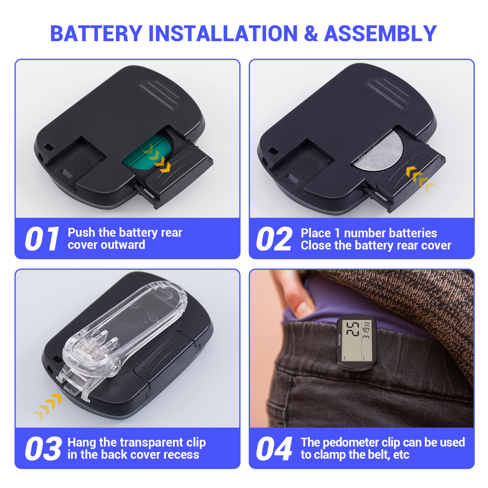 Package Contents: Includes 1 PULIVIA Simple Step Counter 3D Pedometer, 1 CR2032 battery, and 1 clip.