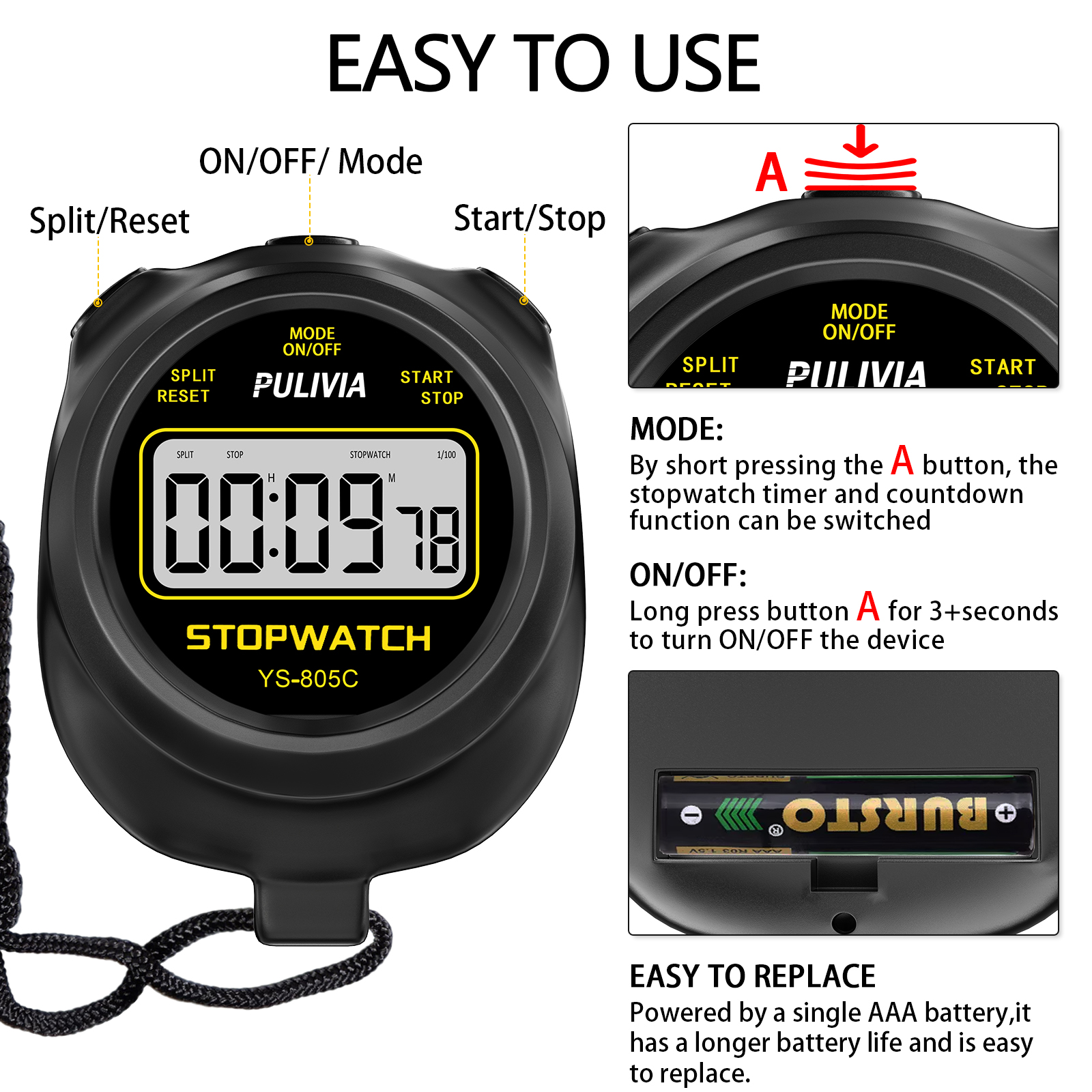 Rechangeable AAA Battery Included--- This PULIVIA stopwatch is equipped with a AAA battery, easy to rechange the battery without any tools.