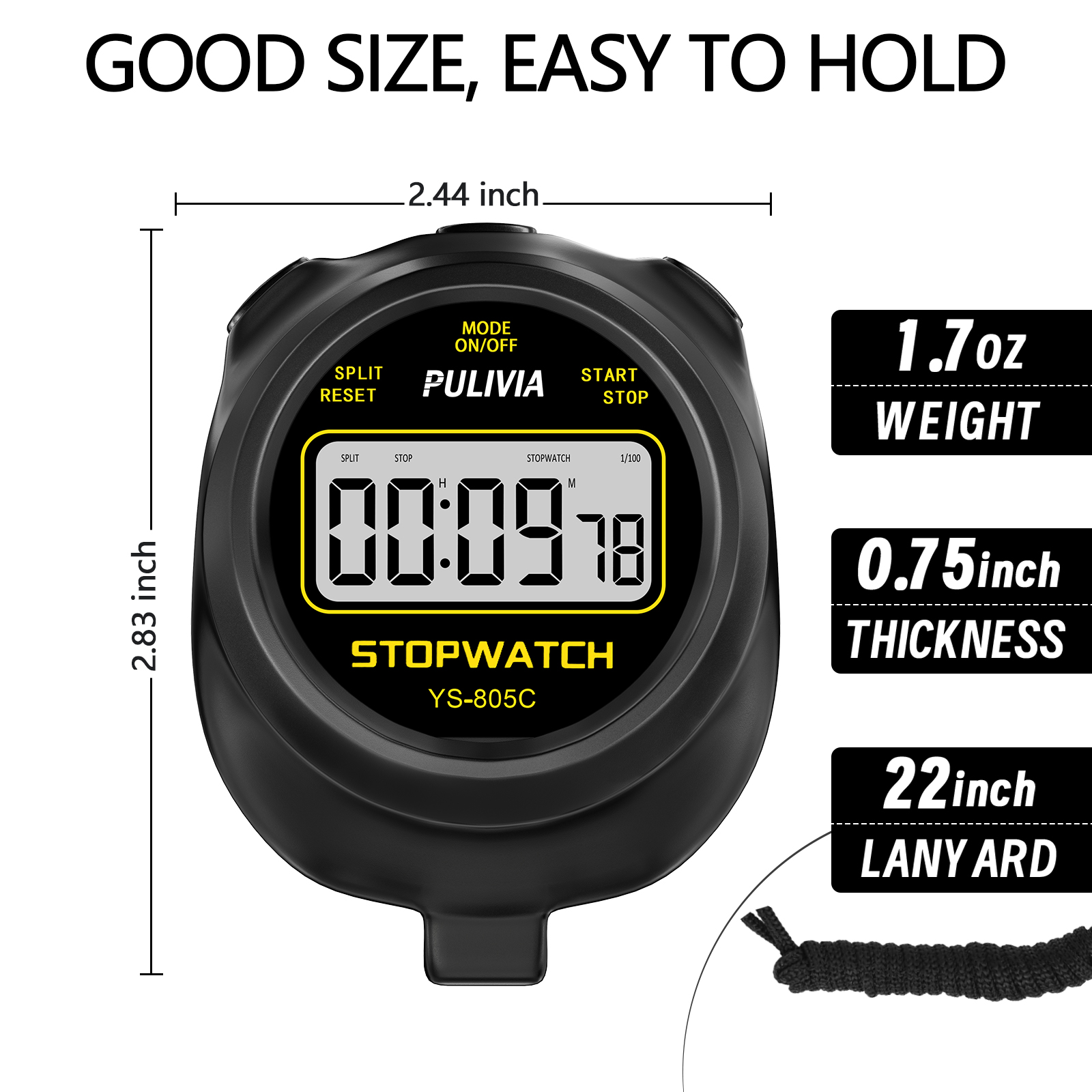 The stopwatch has a good design, and you will feel comfortable and flexible in your hands. It comes with a 47in nylon lanyard (neck strap) which